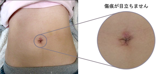 傷はおへそに隠れています。半年ほどで皮膚の腫れが引き目立たない傷になります。